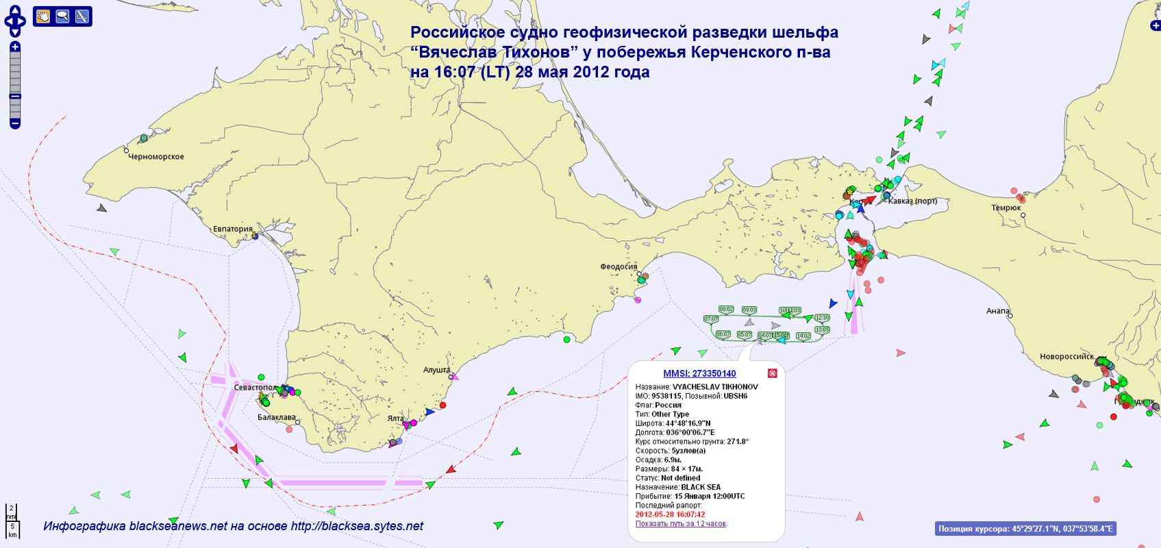 28 мая 2012 года – как следует из данных http://blacksea.sytes.net, судно геофизической разведки шельфа VYACHESLAV TIKHONOV (POLARCUS SELMA), зафрахтованное российским «Совкомфлотом» у дубайской компании Polarcus, вело исследования в Черном море в экономической зоне Украины – в 6-12 милях южнее Керченского полуострова.