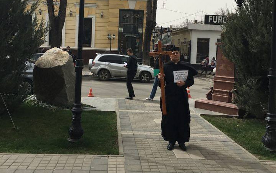 В руках он держал распятие и лист с надписью «Католики не марсиане, а уроженцы Симферополя», передает Центр журналистских расследований.