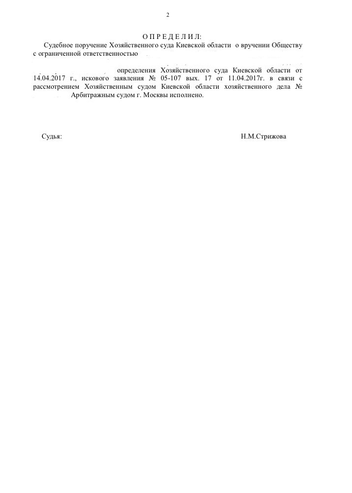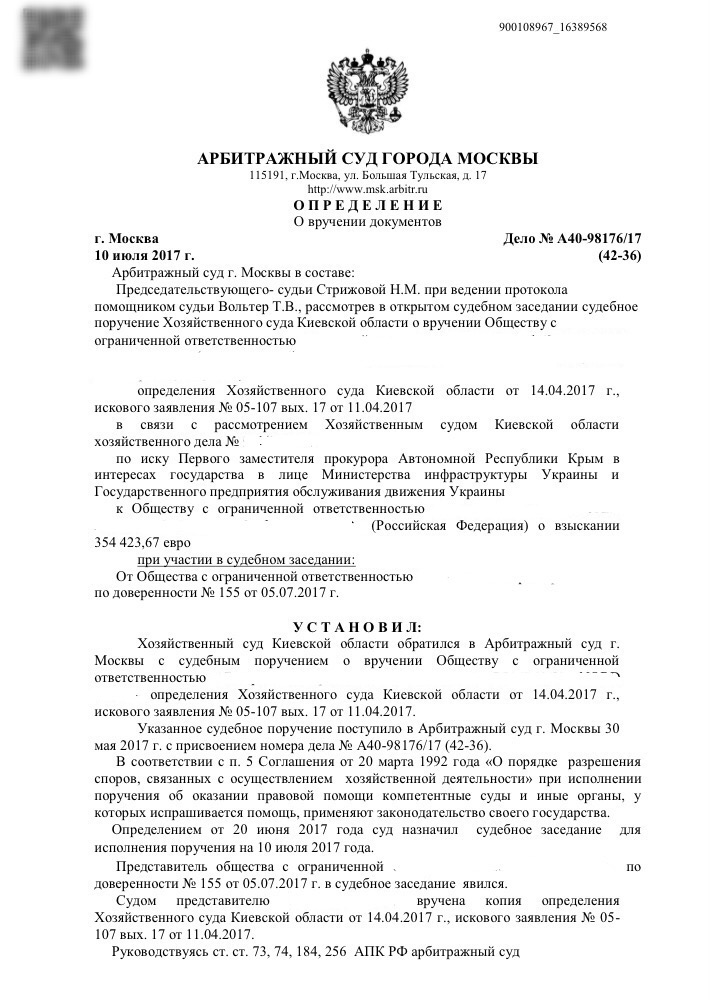 Так, арбітражним судом міста Москви виконано доручення українського суду та вручено відповідачу копію ухвали про початок судового процесу і позовну заяву прокурора.