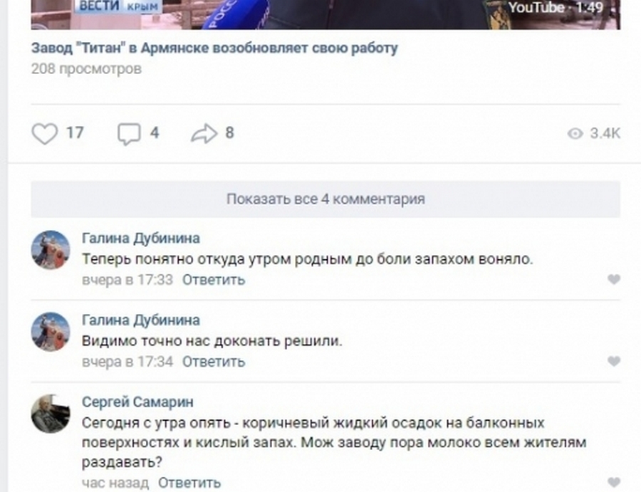 Вот что пишет один из пользователей в паблике «Армянск Информационный» ВКонтакте (орфография и пунктуация сохранены): «Сегодня с утра опять - коричневый жидкий осадок на балконных поверхностях и кислый запах».