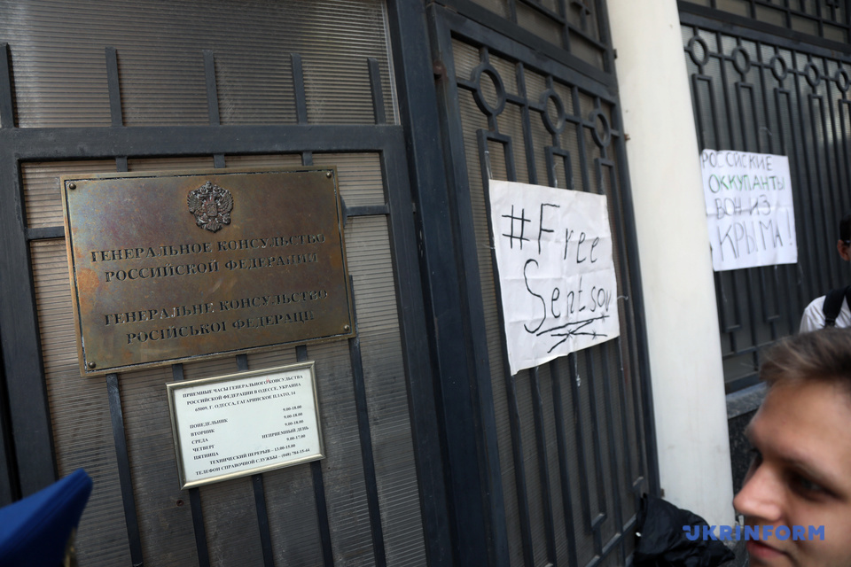 Акція на підтримку українських громадян, які незаконно утримуються російською владою, яка пройшла у неділю під стінами генконсульства РФ в Одесі.