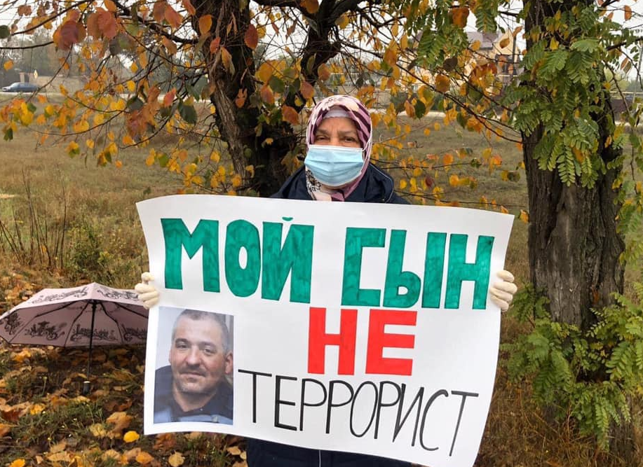 Її одиночний пікет проти переслідування сина зупинила російська поліція. Всього троє матерів фігурантів «справи кримських мусульман» з Красногвардійського вийшли на одиночні пікети з плакатами «Мій син - не терорист».