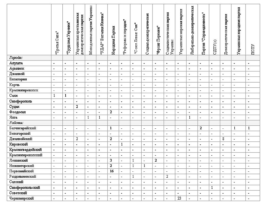 В целом, с учетом результатов выборов в сельские и поселковые советы, в органах местного самоуправления АР Крым имеется представительством 29 партий. Но анализ распределения мандатов, который приведен ниже, подтверждает сделанные выше выводы.