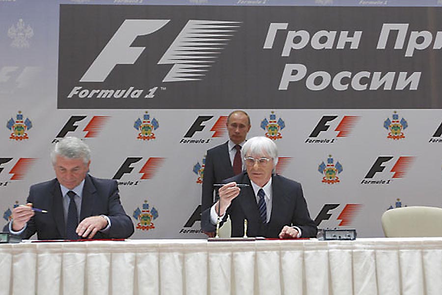 Подписание контракта по Формуле-1 в Сочи. На заднем плане – В.Путин. Фото с сайта premier.gov.ru