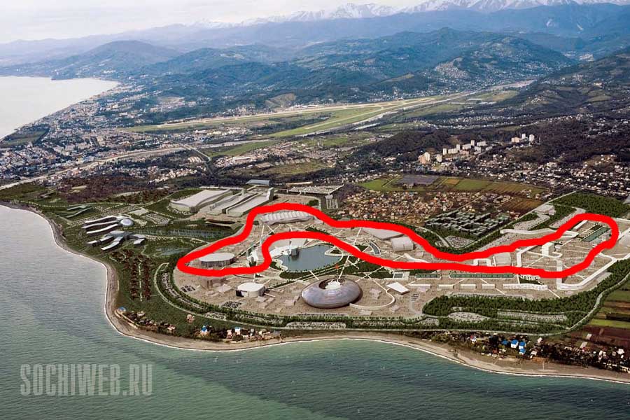 Примерно так пройдет трасса Формулы-1 по приморской части Олимпийского Сочи в Имеретинской низменности. Графика BSNews по материалам Взгляд.Ру на фото с сайта sochiweb.ru