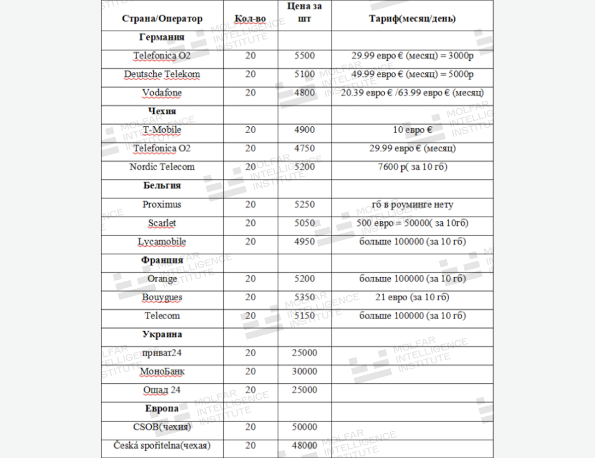 Таблиця SIM-карт, що використовуються росіянами для тестування. Фото: Molfar