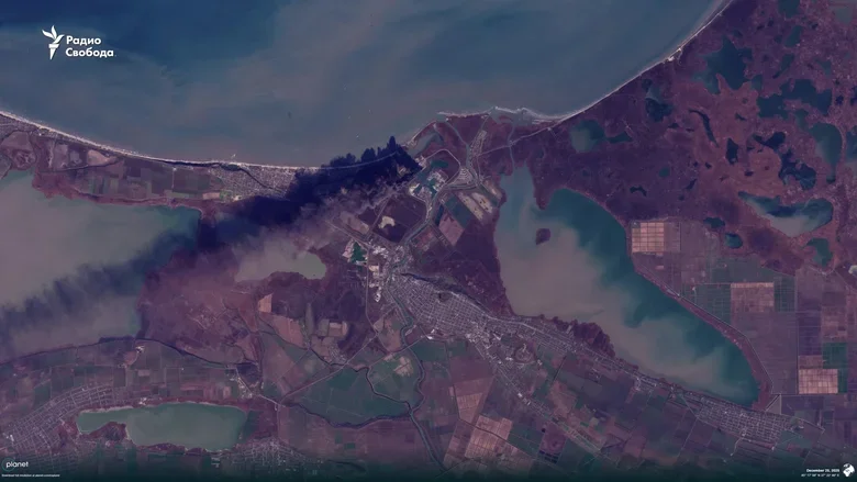 Супутники зафіксували наслідки атаки дронів на російський порт Темрюк у Краснодарському краї. Видно масштабну пожежу на нафтових резервуарах.
