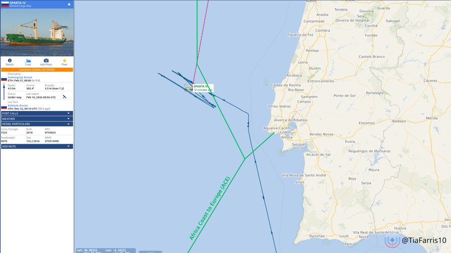 Корабель російського тіньового флоту Sparta IV протягом кількох днів перебував над підводним кабелем «Африканське узбережжя – Європа» у супроводі кораблів ВМФ РФ, ймовірно здійснюючи його картографування.