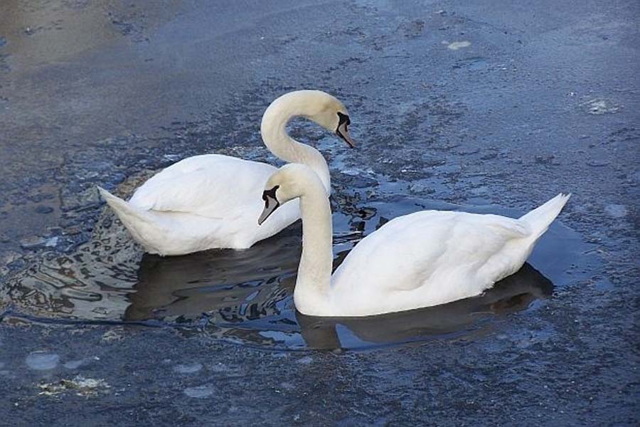Грациозные птицы становятся зимней достопримечательностью города. Немые лебеди – представитель отряда гусеподобных. Весят около 7-15 кг, длина тела достигает 150-170 см, размах крыльев около 220-240 см. Оперение у птиц чисто белое, молодые особи имеют кофейный оттенок, белый окрас появляется на третий год жизни.