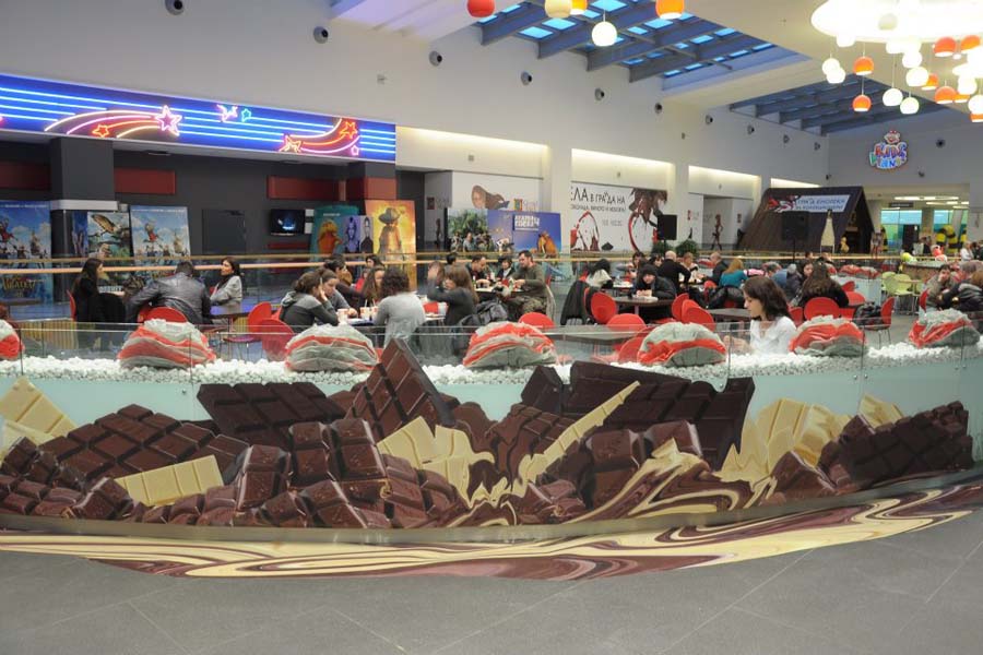 Весь второй этаж центра был преображен. Пространство украшено красными и шоколадными волнами в честь фестиваля шоколада, вина и любви. Хитовый болгарский фильм «Love.net» дал старт неделе любовного кино, которая пройдет с 10 по 16 февраля каждый день с 18:00.