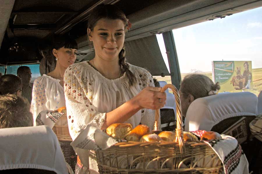 В автобус входят девушки с корзинками выпечки и парни с особыми румынскими кружечками с традиционной румынской водкой – цуйкой. Чуть позже знающие люди расскажут, что есть ещё паленка, и что и ту и другую изготовляют в основном из груш и яблок, но крепость у них разная: у паленки – около 40, а у цуйки она может доходить до 60 градусов.