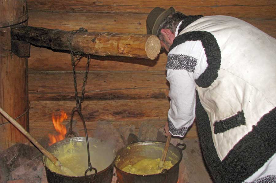 У нас это произошло следующим образом: стемнело, воздух стал холоден и прозрачен, в таинственном полумраке маленького домика на поляне два умельца в гуцульских костюмах начали колдовать над огромными котлами и, как оказалось, готовить на костре настоящую мамалыгу. А затем – чуть покусывающая холодом черная карпатская октябрьская ночь, пьянящий горный воздух, горячая, пахнущая дымком мамалыга с сыром и ещё один вариант местной цуйки – крепкая сливовая хоринка.