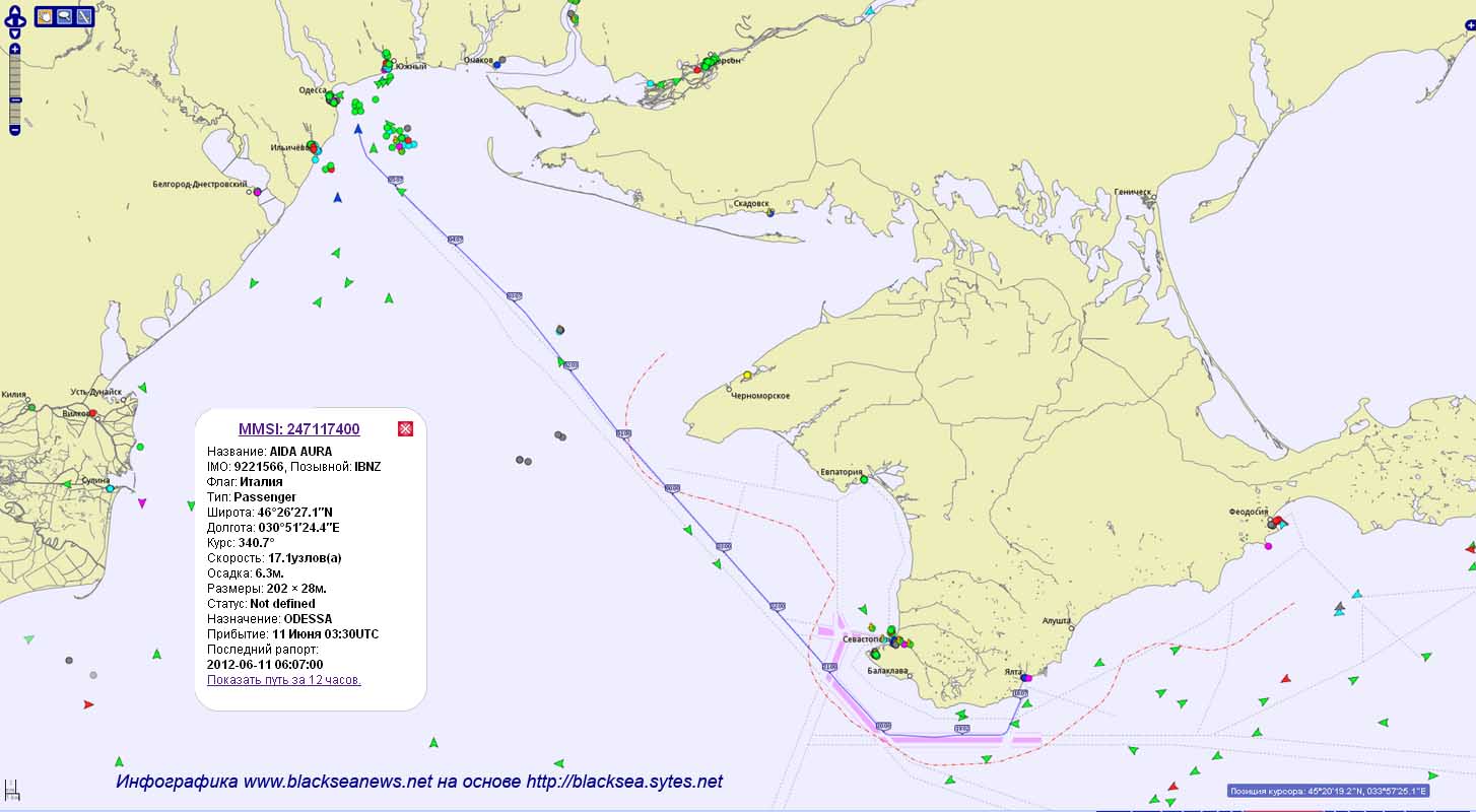 16:53 (LT) 11 июня 2012 года – лайнер AIDAaura вышел из порта Одесса на Варну.