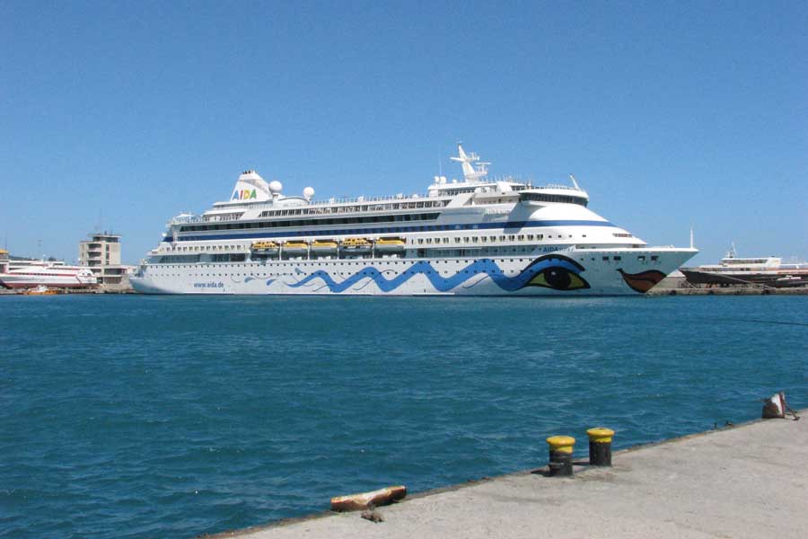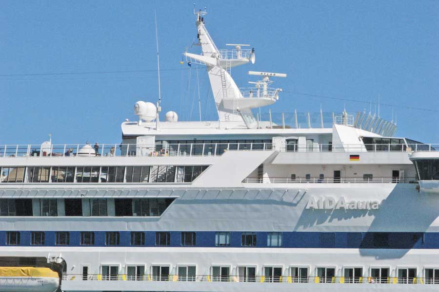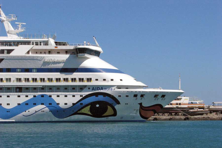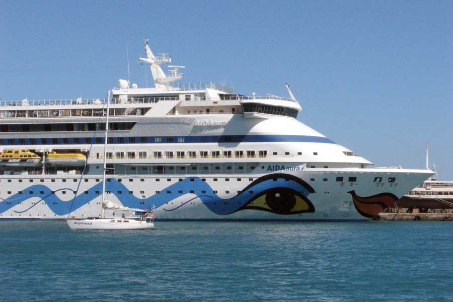 Итак, с начала. На этом снимке лайнер AIDAaura не выходит, а входит в порт. В последнее время многие лайнеры выбирают такой способ захода – кормой вперед, чтобы избежать разворачивания при выходе судна из порта.