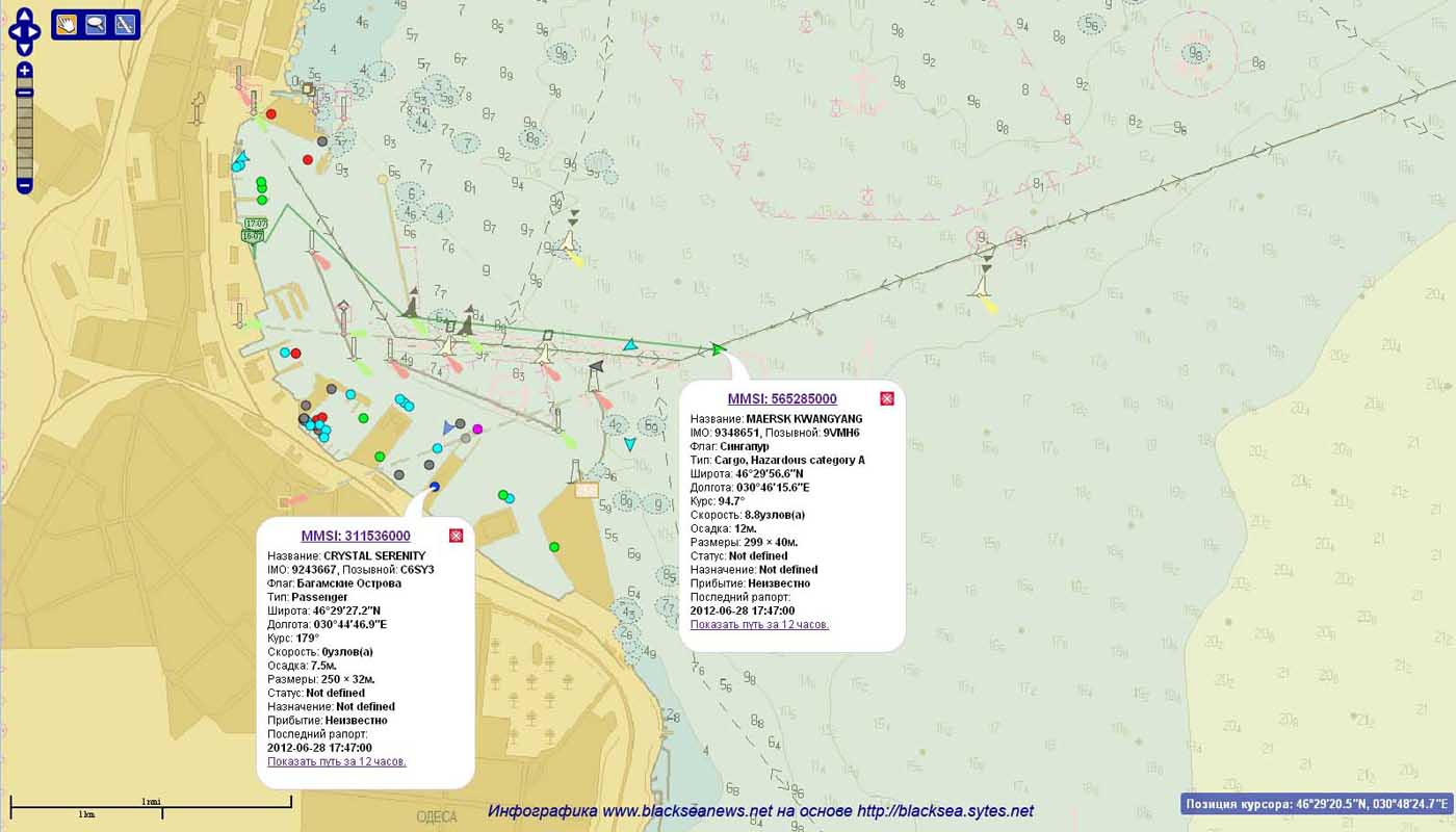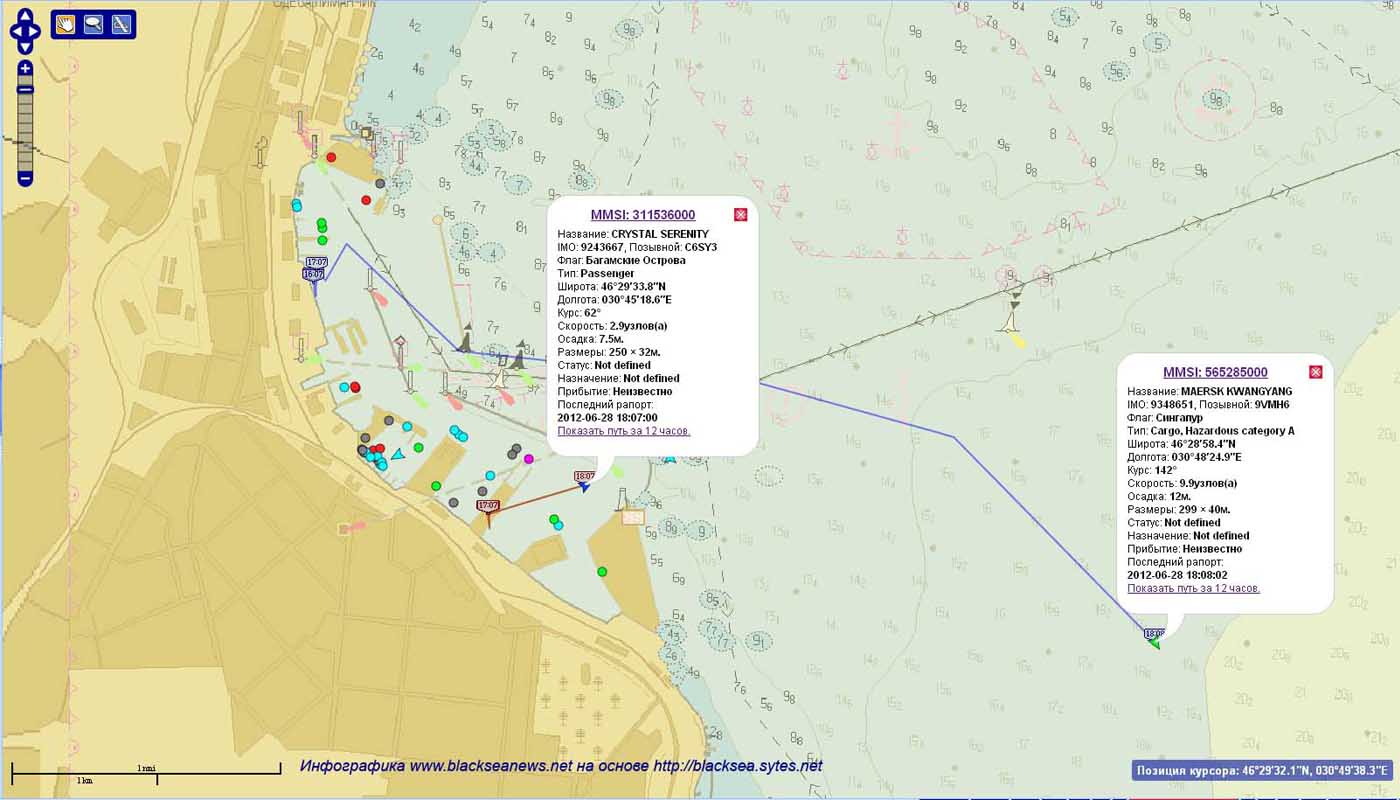 Как видно на карте, сделанной по данным нашего партнера – портала http://blacksea.sytes.net, в это время лайнер CRYSTAL SERENITY еще стоит у причалов Одесского морского вокзала.