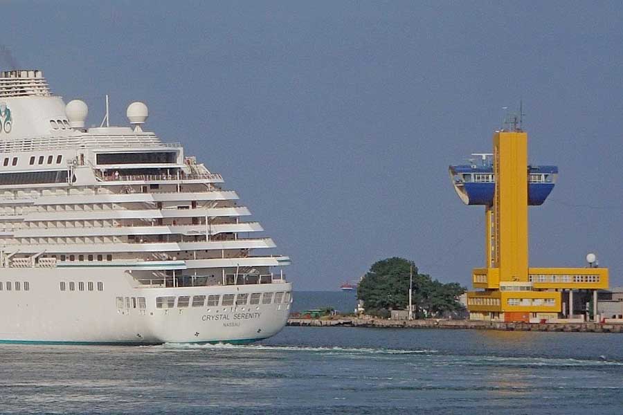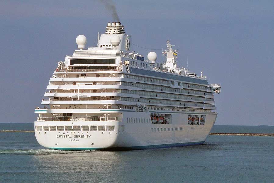 А пока Владимир ТРОФИМОВ занимается проходящим мимо него контейнеровозом, от причала Одесского морского вокзала отходит лайнер CRYSTAL SERENITY.
