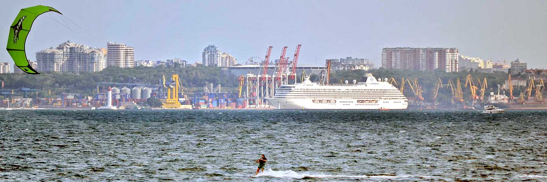 Момент отхода лайнера от причала кормой вперед запечатлел ожидавший этого момента на Лузановском пляже Анатолий ОДАЙНИК. А слева от CRYSTAL SERENITY виден стоящий под погрузкой в порту сухогруз – это греческий балкер OTRADA (Тип судна: Bulk carrier. Год постройки: 1984. Длина и ширина: 190 m X 28 m. Gross Tonnage: 23207, Тоннаж судна: 38434 t. Записанная скорость (Макс/Средн): 12.1 / 10.2 knots. Флаг: Marshall Is [MH]. Позывной: V7MY9. IMO: 8307210, MMSI: 538002926. Судовладелец и оператор: Transbulk Management (Athens, Greece).