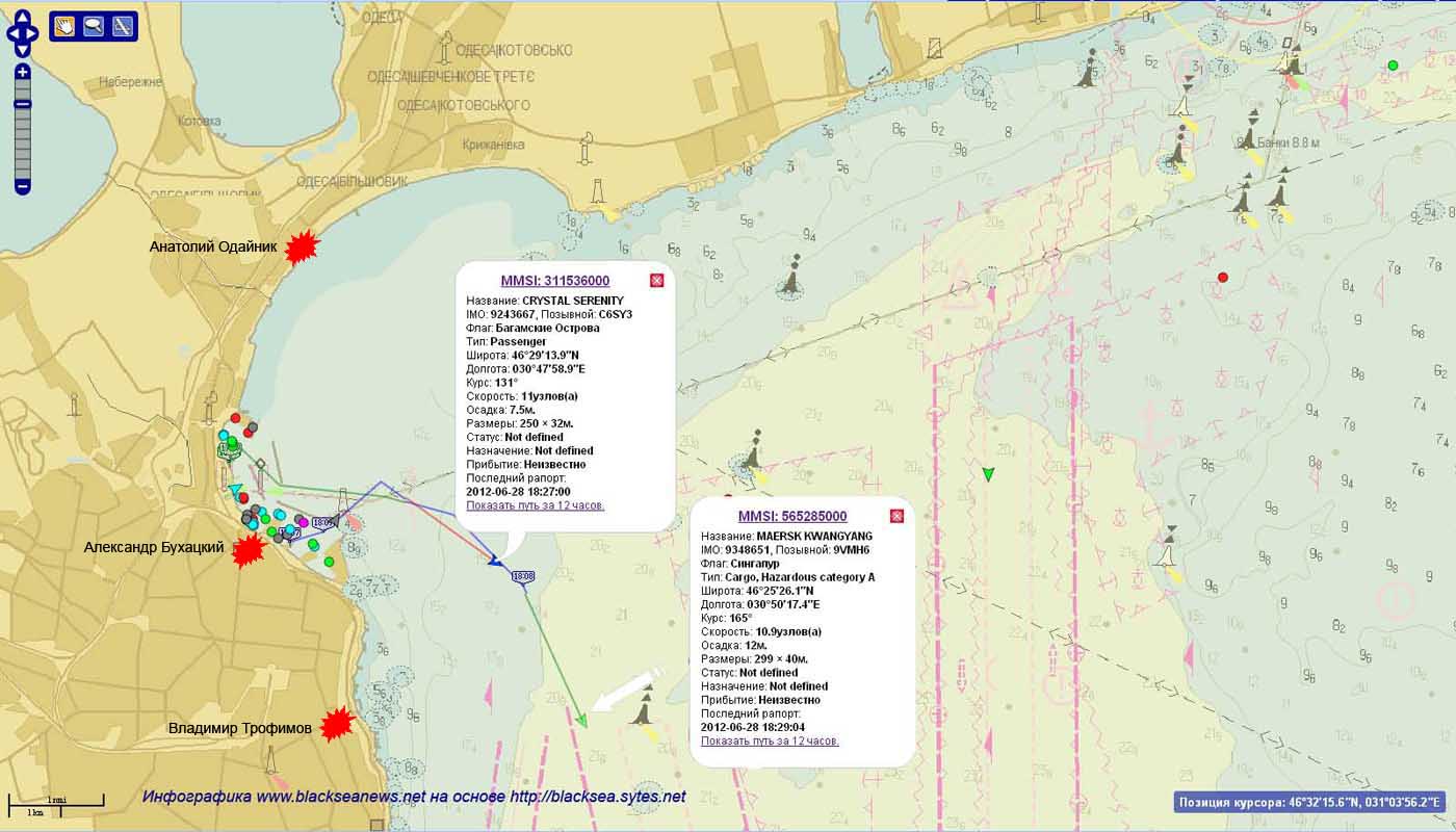 В этот момент – около 18:00 мв 28 июня 2012 года – контейнеровоз вышел из акватории Одесского порта и повернул на юго-восток, взяв курс на пролив Босфор. И попал в поле зрения Владимира ТРОФИМОВА. На карте внизу красными звездочками показаны места, где находились одесские морские фотографы.