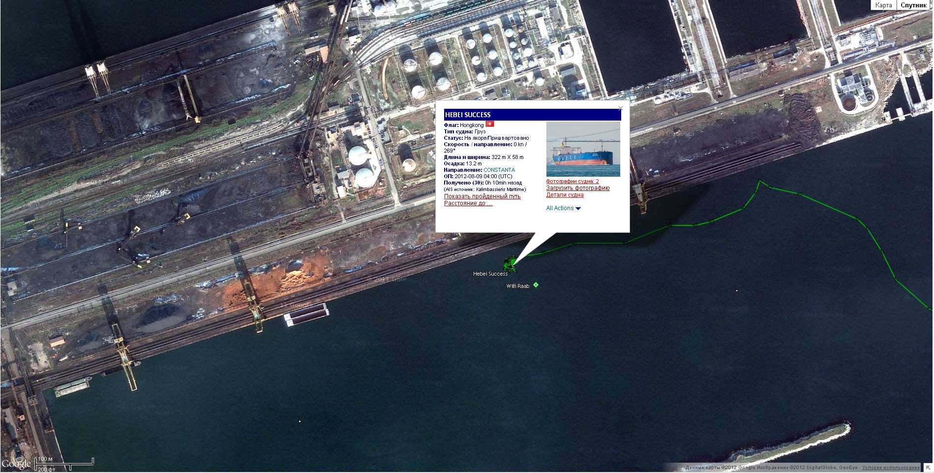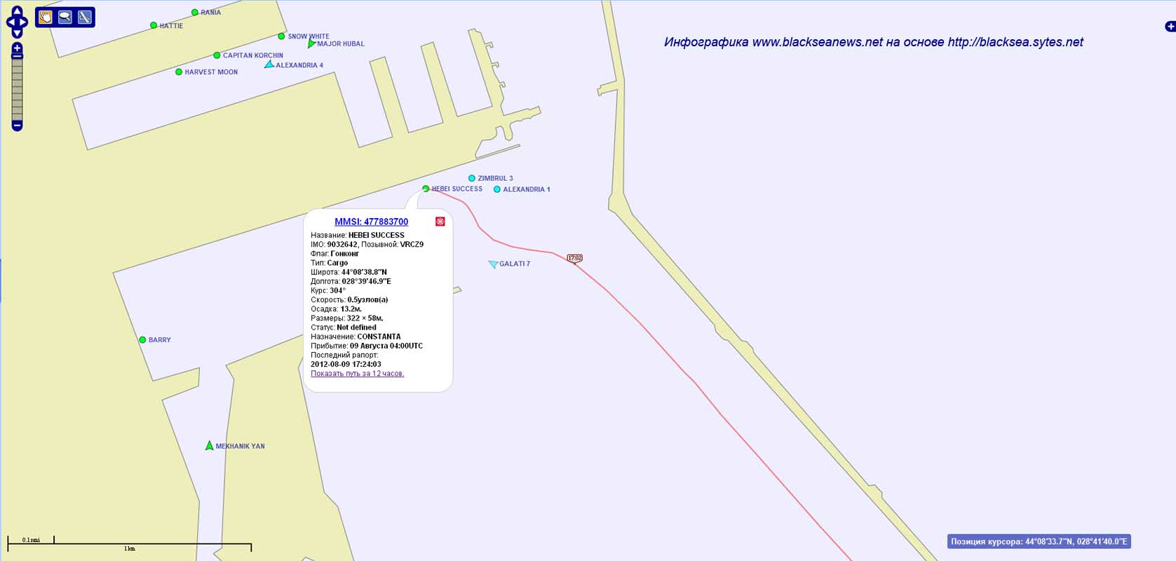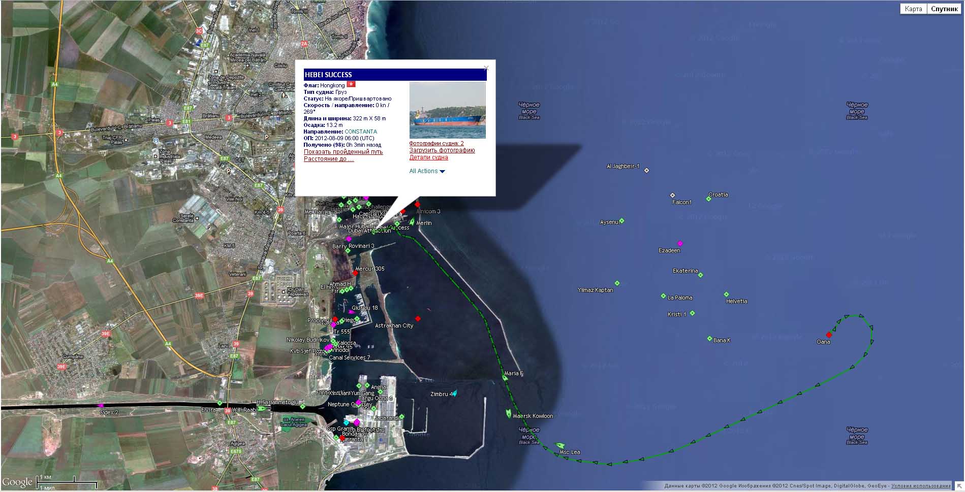 Ну, а мы, с помощью морских АИС – http://blacksea.sytes.net и www.marinetraffic.com, 9 августа 2012 года сопроводили его по Черному морю до Констанцы.