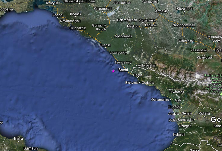 Эпицентр находился в море в 28 км юго-восточнее Сочи на глубине от 5 до 10 км.