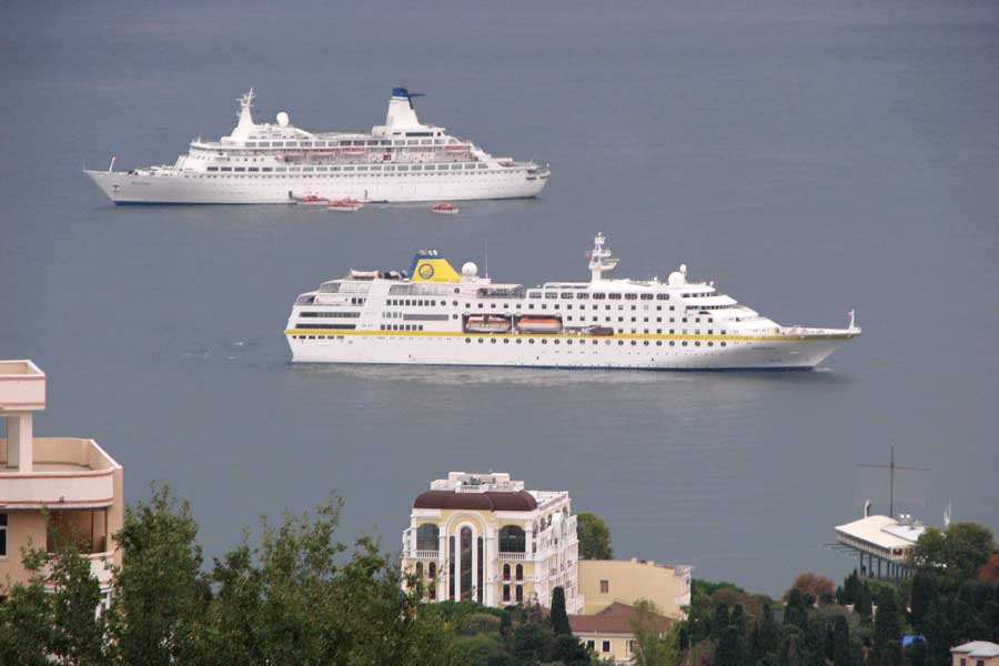 25 октября 2012 года. Ялта. На первом плане HAMBURG выполняет разворот, чтобы зайти в акваторию порта кормой вперед. На втором плане круизный лайнер DISCOVERY спускает на воду катера с туристами. Фото Андрея Клименко, BSNews