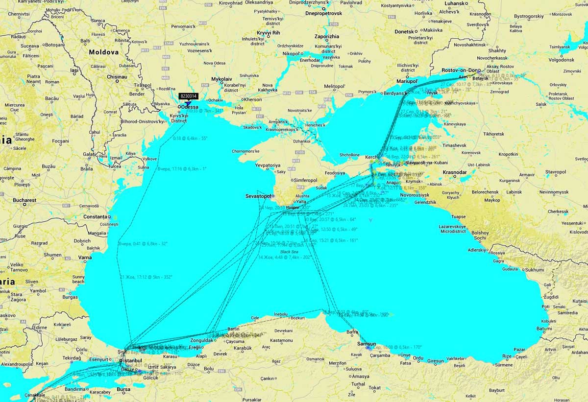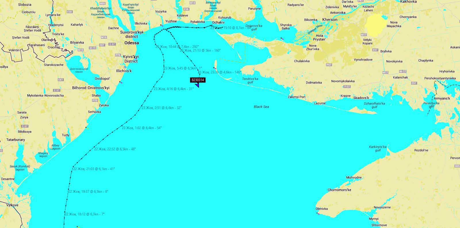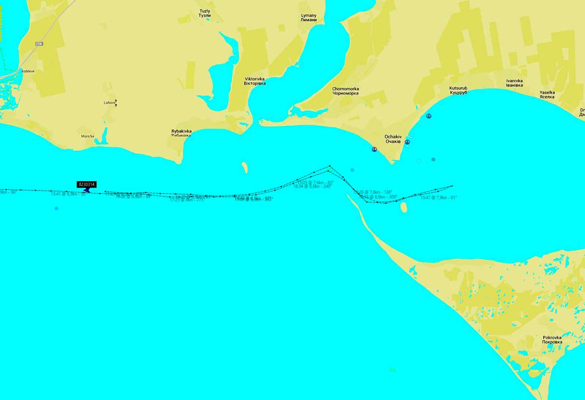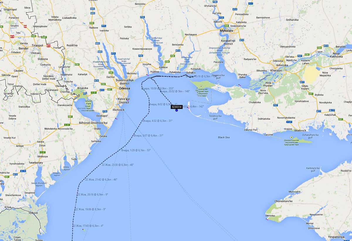 Около 16:00 мв 23 октября 2014 года SEASHELL, направлявшийся в Херсон, через 3 часа 15 минут после нашей публикации о нем резко изменил курс и пошел в обратном направлении. Как видно по карте, судно в это время уже вошло в Днепровско-Бугский лиман.